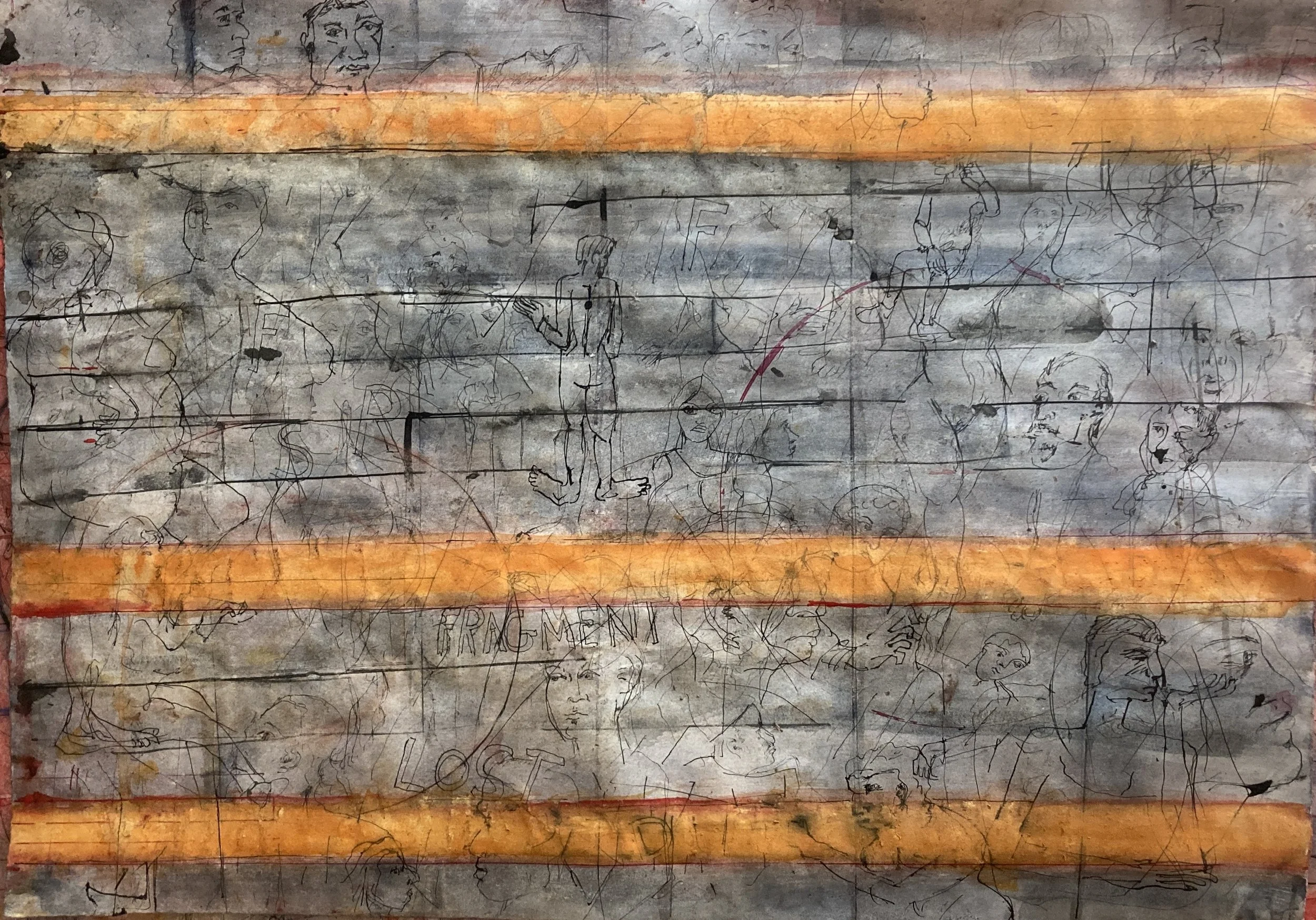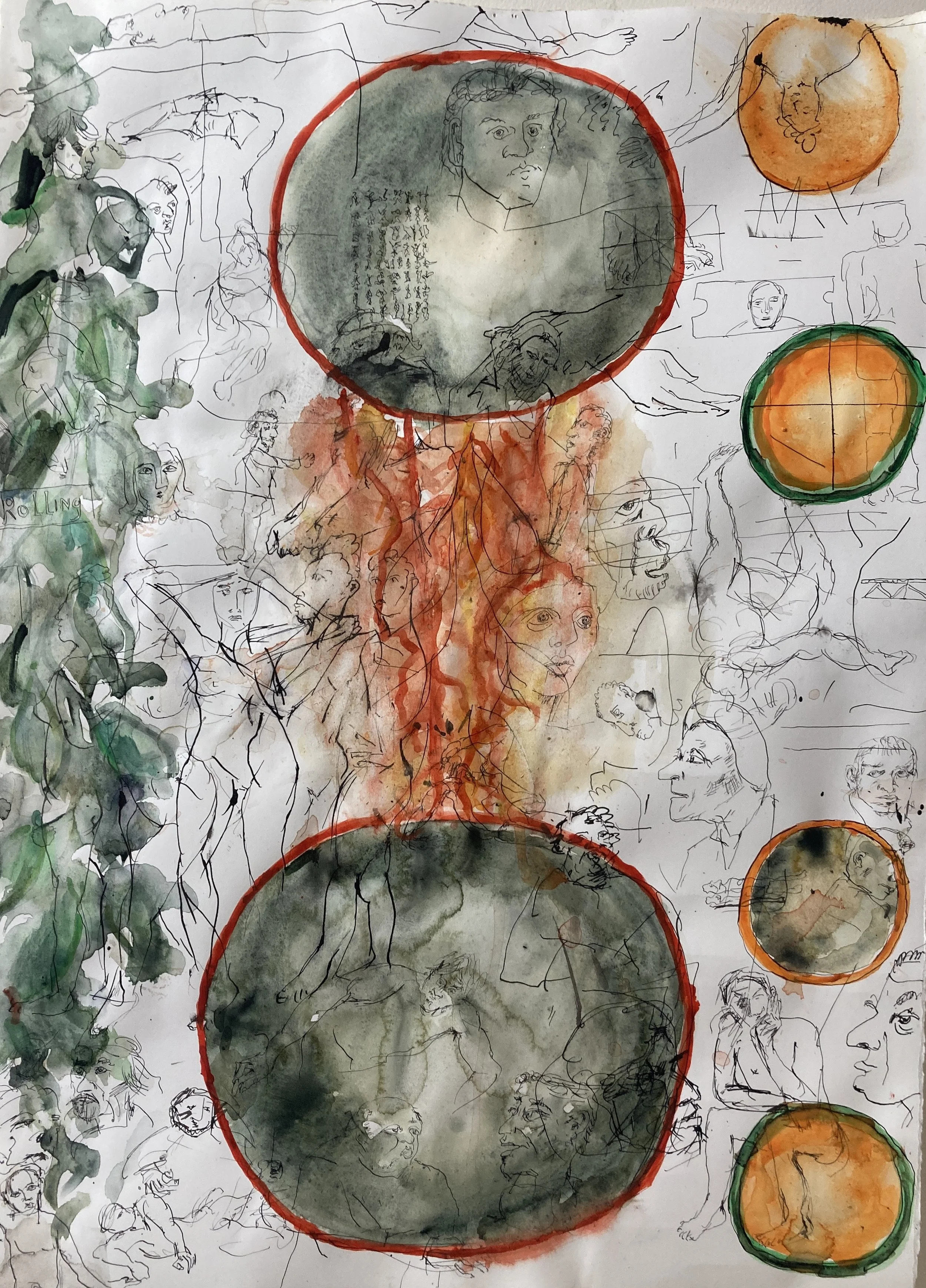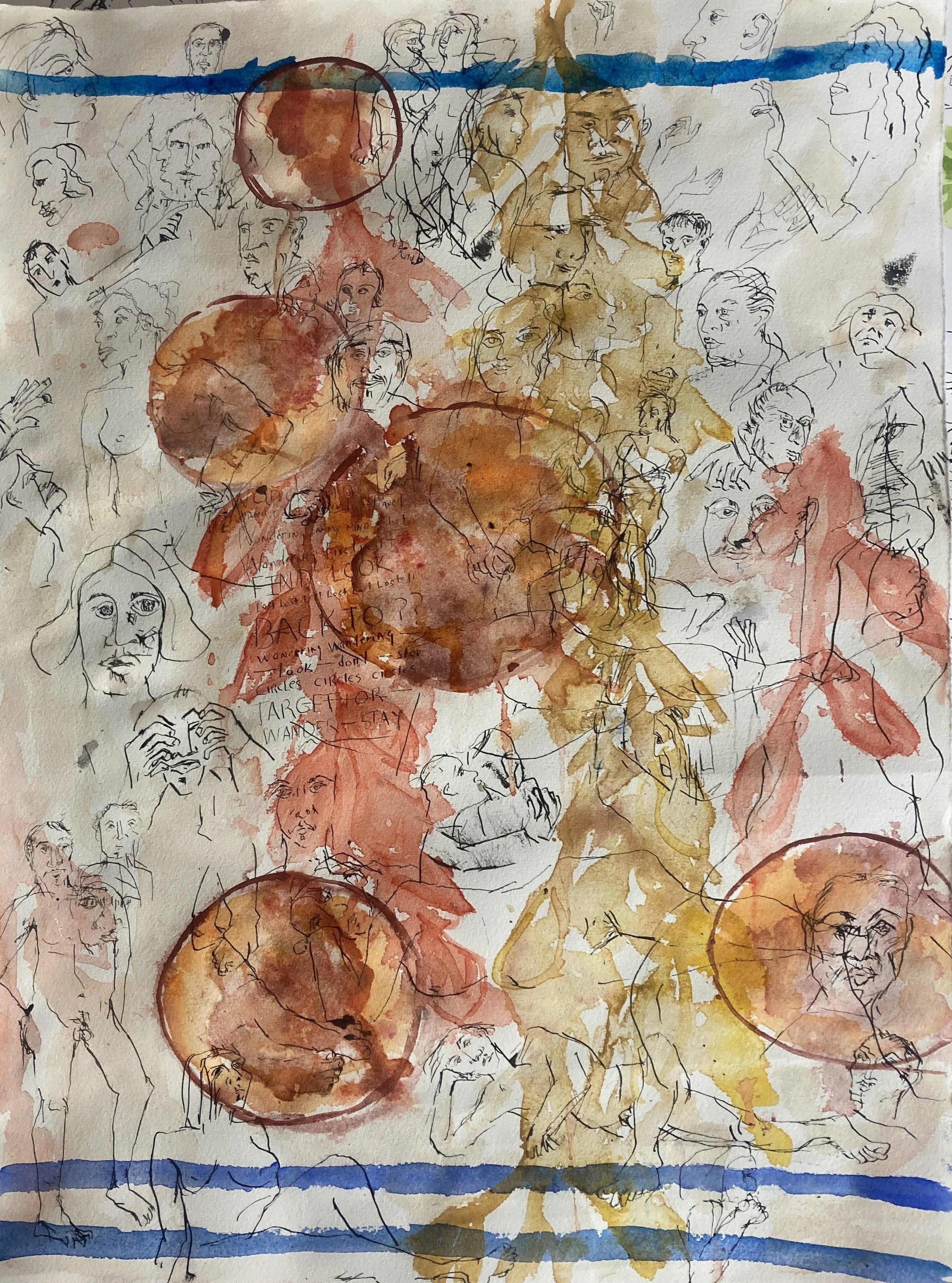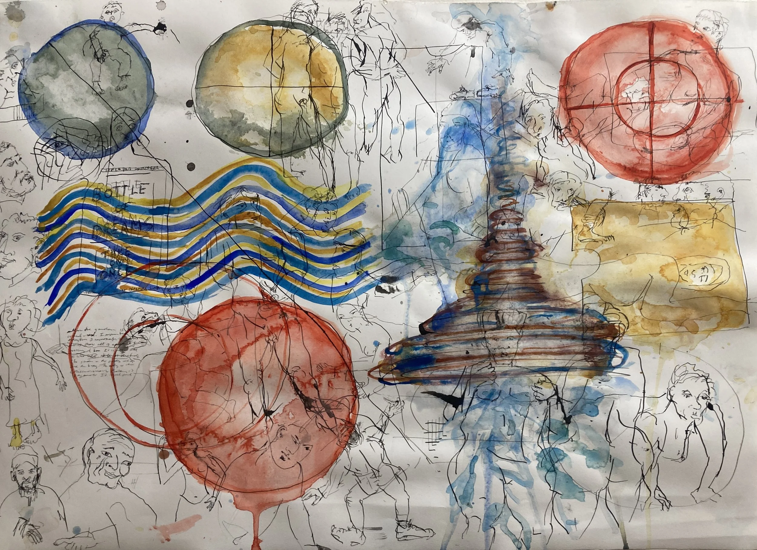 I get hooked on certain words — I am drawing contradictions . I take. I like kinetic. I like stillness. I draw conclusions that I am not aware of—This sounds absurdly pretentious. It could be I am just fooling around. They are cartoons to pass the time The last four drawing have become a more specific dialogue between a figurative means of representing and an abstract way of representing. The idea that something is not what it first appears to be is perhaps an underlying theme of my work.